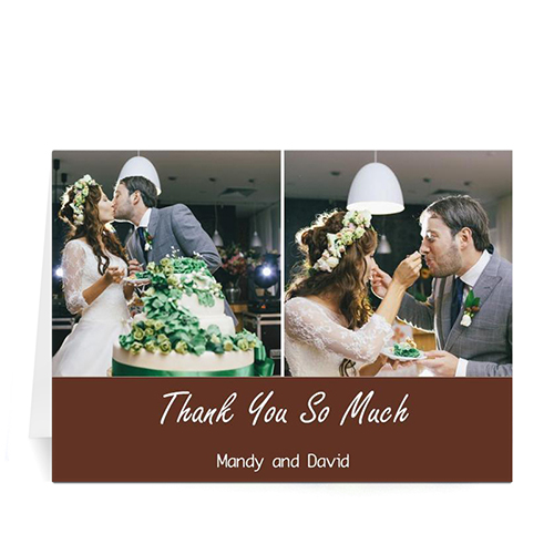 Give your wedding party guests a token of your appreciation with a personalized wedding thank you cards and thank you for sharing in your special day. Our quality 5x7 folded wedding photo card is fully customizable with your own photos, designs or pictures and even your custom message. Simply select a pre-designed photo card template, and use our online editing tools to insert and modify your uploaded images. Enter your custom message in the text box you want to be printed on your greeting cards. Before placing order, you can view an instant full color preview of your photo cards to make sure everything is perfect. A blank envelope will be included per 5x7 folded card for mailing. Cheap custom printed cards work great as photo wedding cards, wedding party invitation cards and personalized wedding thank you cards.