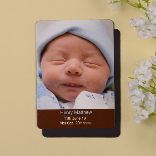 Easily create your unique baby announcement magnet online using our online builder. Simply pick a pre-designed photo magnet template and use our builder to insert pictures and add personal message. Before submitting order, you can review your personalization online to make sure everything is in place. Our quality photo magnet is 2.5” x 3.5” in size with round corners and your photograph will be laminated with high gloss finish. Cheap photo magnets with no minimum order requirement make great baby gifts for boy, baby shower save the date magnets, birth announcement magnets, baby announcement gifts.