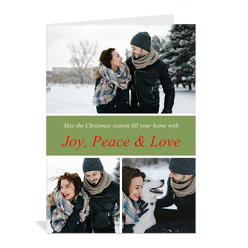 Make this holiday season extra special and memorable for your loved ones with personalized photo cards and invitations. Easily create your own greeting cards with pictures online using our online editing tools. 5x7 folded photo card, with its gloss finish on front and back give your photos sharper and more vivid colors. Inside of the card is matte so you can write on it. You can easily design all four sides of your cards with text and pictures using our online editing tools. Before placing order, you can view an instant full colour preview of your personalization so that to know exactly how your cards will look like. Each custom greeting card comes with an envelope for mailing. Sold individually, fast turnaround and no minimum order required. Cheap photo cards work great as Christmas cards for colleagues, family members and friends.