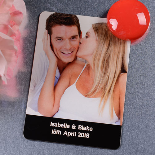 Inexpensive personalized photo save the date magnets are a unique and personal way to inform your loved ones of your upcoming wedding day. Consider our discount wedding magnets which can be fully customizable with your favorite photos, as well as custom text like your name, wedding date and reception venue. To do so simply pick a pre-designed wedding magnet template and use our online interface to insert pictures and add text. Before submitting order, you can review your personalization online to make sure everything is in place. Our quality photo magnet is 2.5” x 3.5” in size with round corners and your photograph will be laminated with high gloss finish. Custom magnets at wholesale price with no minimum order requirement make great wedding save the date magnets, wedding announcement, wedding favors and thank you gifts.
