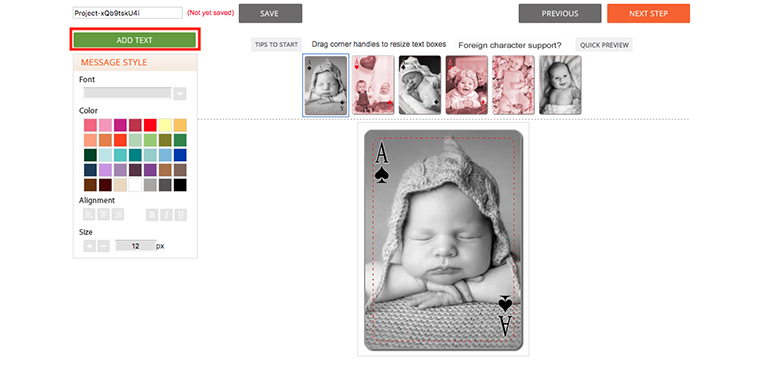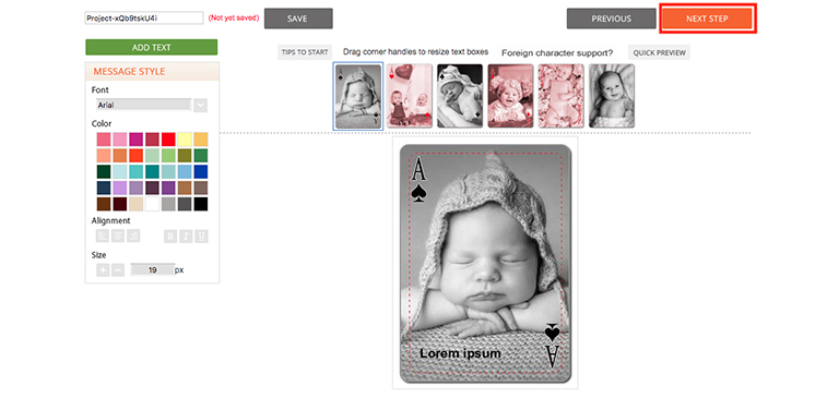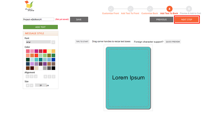Repeat the steps in STEP 6 above to add text to the template, click on the Next Step button at top right when you are ready.
